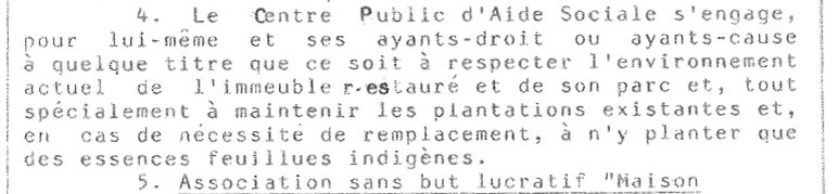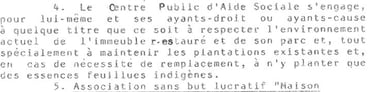En page 6, cet acte stipule notamment que le CPAS s'engage à "quelque titre que ce soit à respecter l'environnement actuel de l'immeuble restauré et de son parc et, tout spécialement à maintenir les plantations existantes" (...). Le projet actuel de la crèche est en tout point contraire à l'engagement pris par le CPAS de Grez-Doiceau. L'expérience le montre dans 95% des cas : un coup de canif dans un tel engagement justifie moult déviances ultérieures ...
