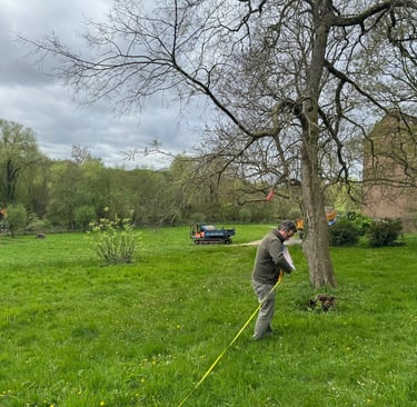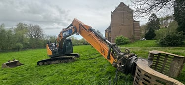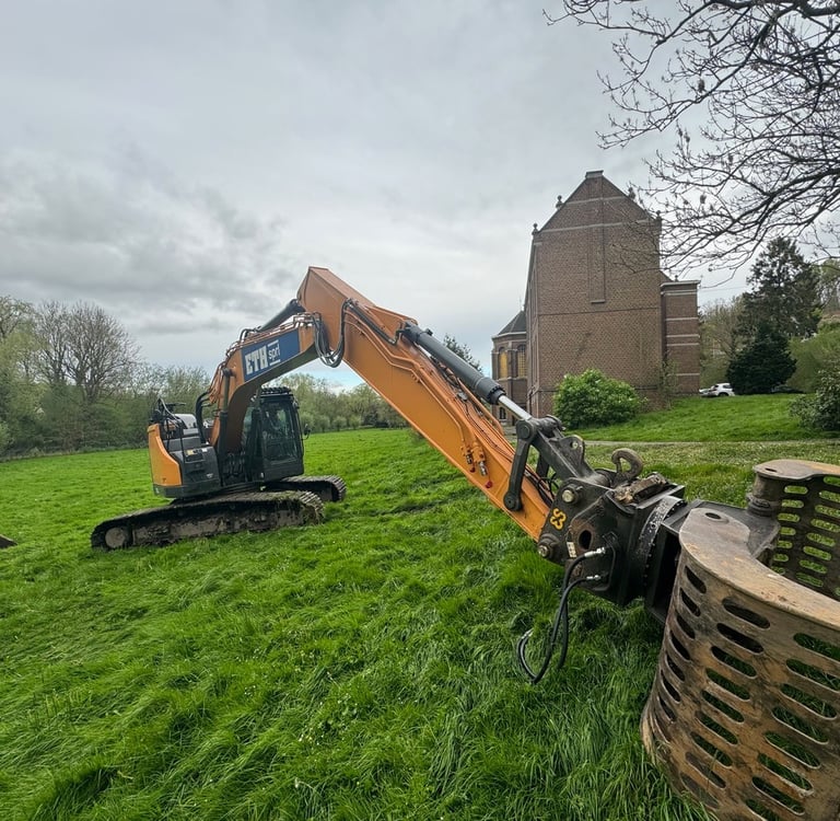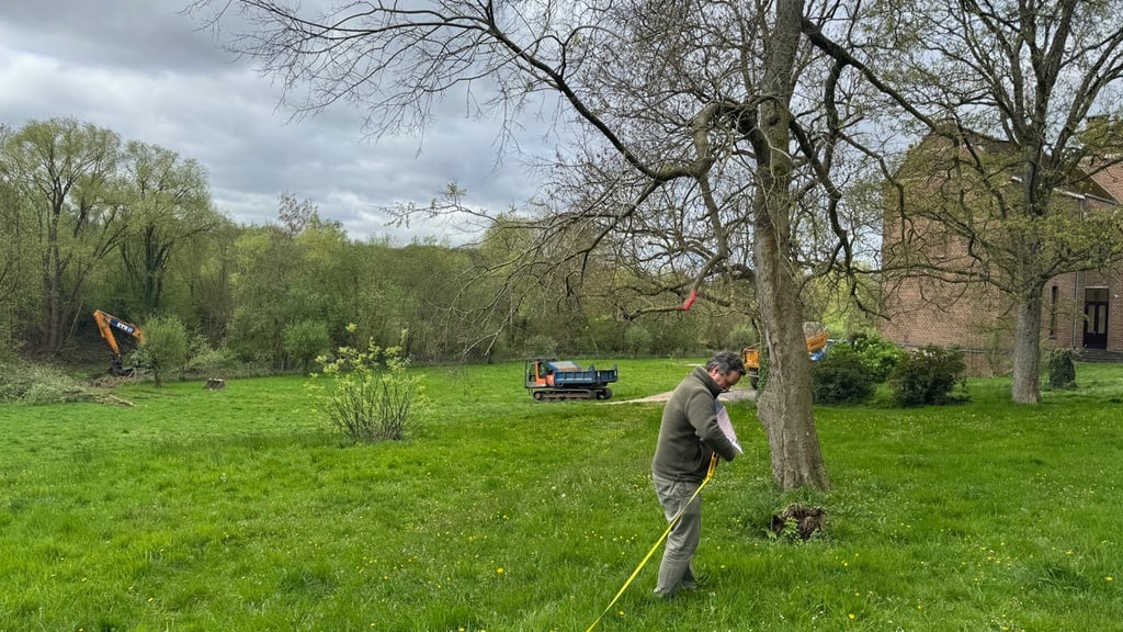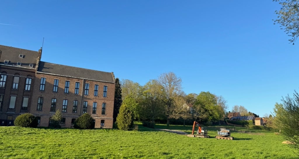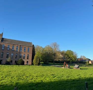 Grue sur le lieu prévu pour l’implantation du nouveau bâtiment. Au mois d’avril 2024, cette grue était destinée à curer la rivière le Train, en contrebas